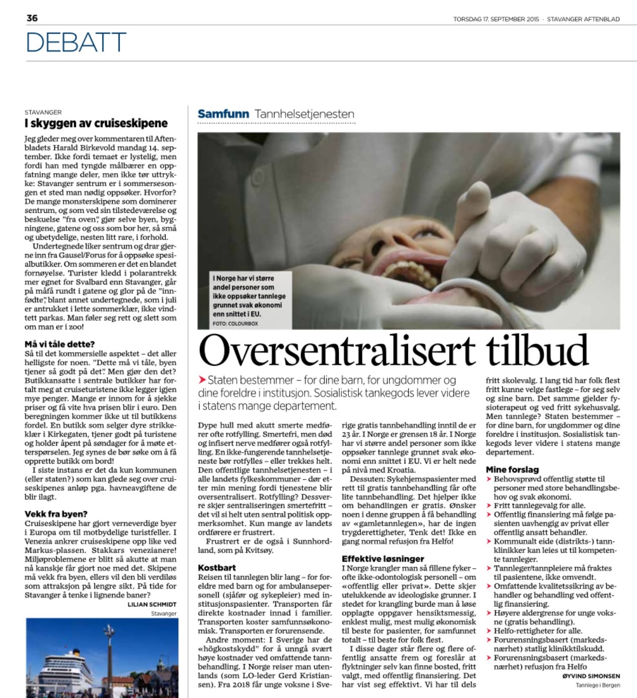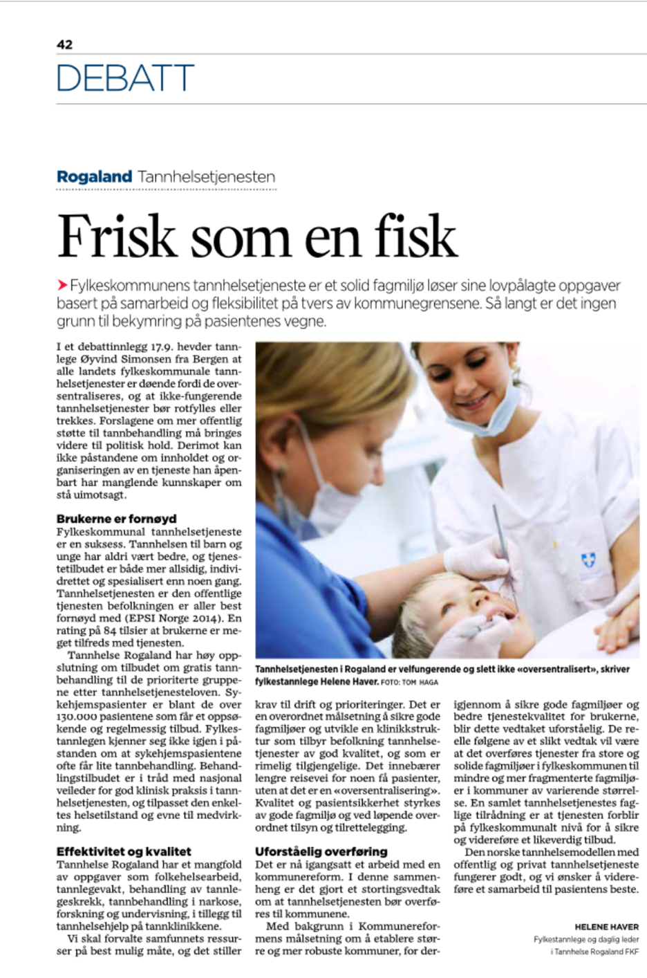 I et debattinnlegg 17.9.2015 hevder tannlege Øyvind Simonsen fra Bergen at alle landets fylkeskommunale tannhelsetjenester er døende fordi de oversentraliseres, og at ikke-fungerende tannhelsetjenester bør rotfylles eller trekkes. Forslagene om mer offentlig støtte til tannbehandling må bringes videre til politisk hold. Derimot kan ikke påstandene om innholdet og organiseringen av en tjeneste han åpenbart har manglende kunnskaper om, stå uimotsagt.