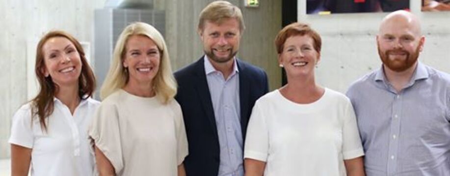 Helse- og omsorgsminister, Bent Høie og ordfører i Stavanger, Christine Sagen Helgø sammen med kommende studenter på BIs nye nasjonale lederutdanning for primærhelsetjenesten. - Kompetanse er helt avgjørende for å sikre god omsorg, poengterte statsråden. En av studentene han møtte var overtannlege Ingvild Dommersnes (tv).